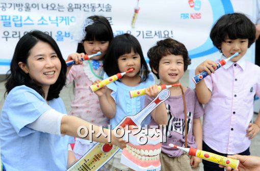 [아시아경제 이재문 기자]필립스전자가 30일 서울 청계광장에서 4-12세 어린이들을 대상으로 무료구강검진을 실시하고 올바른 칫솔질방법을 교육하고 있다. 이번에 선보인 어린이용 음파전동칫솔 '소닉케어 키즈'는 음파로 생성된 공기방울이 칫솔모가 닿지 않는 구석까지 깨끗하게 세정해 칫솔질이 미숙한 아이들에게 탁월한 제품이다.