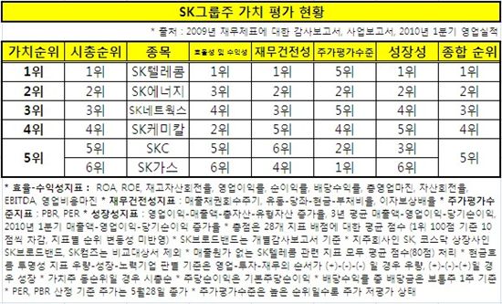 SK그룹 계열사 중 유가증권시장에 상장된 SK텔레콤 SK에너지 SK네트웍스 SK케미칼 SKC SK가스 (이상 시가총액 상위순) 등 제조ㆍ유통ㆍ물류 업종으로 분류되는 6개사의 지난해 재무제표에 대한 감사보고서, 사업보고서 및 지난 1ㆍ4분기 분기보고서를 종합 분석해본 결과, 가치주 1위는 효율-수익-재무상태-성장성 모든 부문에서 1위를 차지한 SK텔레콤으로 나타났다.