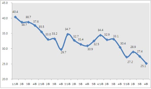 1일 여론조사전문기관 리얼미터(대표 이택수)가 공개한 5월 마지막 주 정례 여론조사 결과에 따르면 박 전 대표의 지지율은 지난주 대비 2.3%p 하락한 25.1%를 기록했다. 차기 지지율은 여전히 1위를 유지한 것이지만 본인 지지율로서는 최저치를 기록했다.