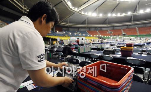 [아시아경제 이재문 기자]6.2 지방선거 투표 진행 중인 2일 오후 서울 올림픽공원 체조경기장 개표소에서 관계자들이 개표를 준비하고 있다.