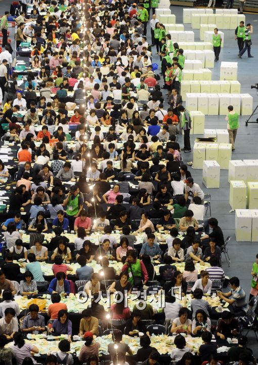 [아시아경제 이재문 기자]6.2 지방선거가 종료된 2일 오후 서울 송파구 올림픽공원 체조경기장에 마련된 송파구 개표소에서 6.2지방선거 개표가 진행되고 있다.