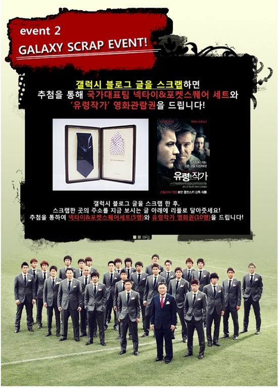 [아시아경제 최대열 기자]제일모직 남성복브랜드 갤럭시는 대한민국 축구 대표팀 공식슈트 협찬을 기념해 오는 10일까지 온라인 이벤트를 진행한다.