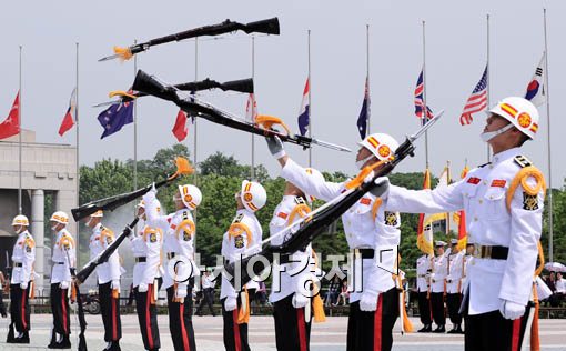 [아시아경제 윤동주 기자] 현충일을 맞아 6일 서울 용산구 전쟁기념관에서 해병대 의장대가 의장시범을 보이고 있다.