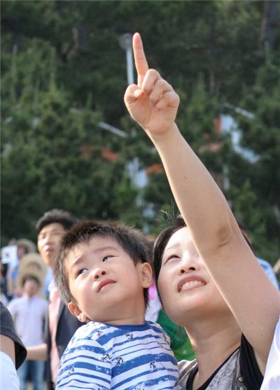 $pos="C";$title="";$txt="";$size="550,767,0";$no="2010061017350834858_1.jpg";@include $libDir . "/image_check.php";?>[아시아경제 이재문 기자]한국의 첫 우주발사체 '나로호'가 10일 오후 고흥 나로우주센터에서 궤적을 그리며 우주를 향해 발사되자 남열 해수욕장에 모인 한 관람객이 아이에게 손짓으로 위치를 알려주고 있다. 현재 나로호는 통신두절상태이며 2시간 후 성공여부를 확인할 수 있는것으로 알려졌다. 고흥=이재문기자 moon@