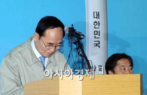[아시아경제 이재문 기자]안병만 교육과학기술부 장관이 10일 오후 고흥 나로우주센터에서 통신두절 후 폭발한 나로호에 대해 공식 발표를 마친 뒤 인사를 하고 있다.