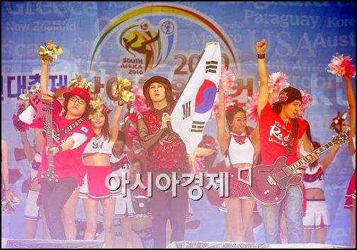 [아시아경제 박성기 기자]그룹 트랜스픽션(TransFixion)이 12일 오후 5시40분 서울 삼성동 코엑스 앞에서 진행된 SBS 생방송 '2010 남아공월드컵 국민응원대축제 승리의 함성'에서 열창하고 있다.