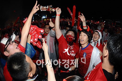 [아시아경제 이기범 기자]12일 오후 서울광장에서 열린 '2010 남아공 월드컵' 한국 대 그리스 전 시민거리 응원전에 나선 시민들이 승리에 기뻐하고 있다.