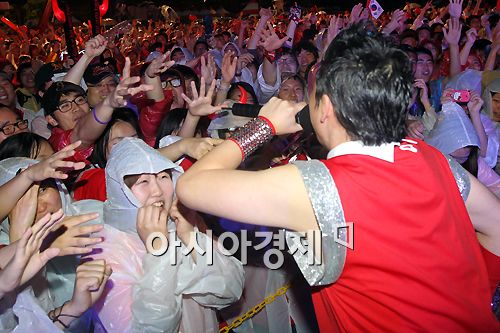 [아시아경제 한윤종 기자]2010 남아공월드컵 '한국 대 그리스' 전의 승리를 기원하는 '플로팅 아일랜드 거리응원전'이 12일 오후 서울 한강시민공원 반포지구에서 펼쳐지고 있는 가운데 가수 싸이가 멋진 공연을 선보이고 있다.
