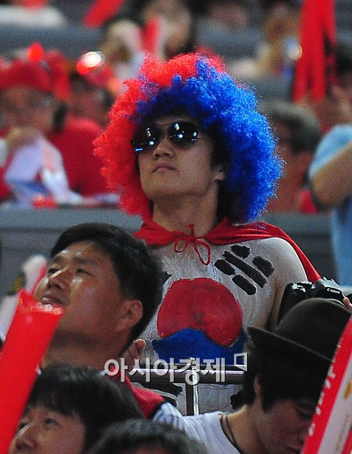 [아시아경제 윤동주 기자] 12일 오후 2010 남아공 월드컵 조별 예선 첫 경기 그리스전을 승리로 장식한 가운데 서울 상암동 월드컵 경기장에 한 시민이 이색적인 복장을 한 시민이 승리의 기쁨을 나누고 있다.