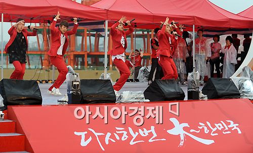 [아시아경제 한윤종 기자]2010 남아공월드컵 '한국 대 그리스' 전의 승리를 기원하는 '플로팅 아일랜드 거리응원전'이 12일 오후 서울 한강시민공원 반포지구에서 펼쳐지고 있는 가운데 가수 비스트가 멋진 공연을 선보이고 있다.