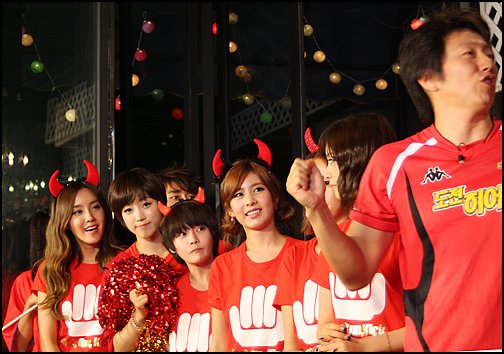 [아시아경제 박성기 기자]영화 '고사 두 번째 이야기:교생실습' 배우들과 그룹 티아라, 전 축구 선수 유상철과 배우 김수로가 진행하는 SBS '도전 히어로' 출연진이 12일 오후 '2010 남아공 월드컵 대한민국 대 그리스' 경기를 함께 응원했다.