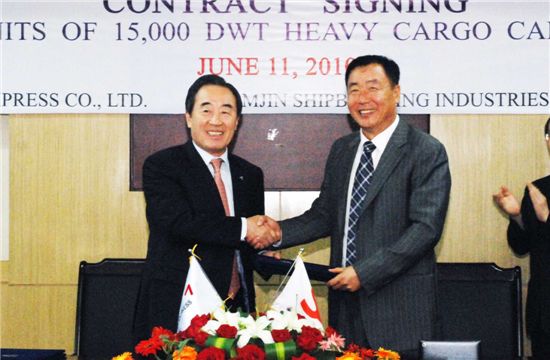 $pos="C";$title="";$txt="지난 11일 중국 산둥성 웨이하이에 위치한 한국 삼진조선 웨이하이조선소에서 열린 계약행사에서 기념촬영을 하고 있는 이원태 사장(왼쪽)과 삼진조선 강영일 회장. 이날 대한통운은 해상 중량물 운송능력 강화를 위해 1만5000t급 중량물 전용선 두 척을 발주했다. ";$size="550,360,0";$no="2010061408025152447_1.jpg";@include $libDir . "/image_check.php";?>[아시아경제 손현진 기자]대한통운(대표 이원태)은 중량물 해상운송능력 강화를 위해 중량물 전용선 두 척을 발주했다고 14일 밝혔다.