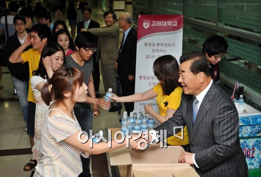 [아시아경제 이재문 기자]이기수 고려대 총장과 총학생회 학생들이 기말고사가 시작되는 14일 오전 서울 고려대학교 교내에서 빵과 음료를 나눠주며 응원과 격려를 하고 있다.