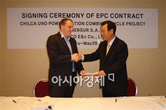 $pos="C";$title="";$txt="포스코건설은 지난달 29일(현지시간) 페루(Peru)의 수도 리마(Lima)에서 프랑스 지디에프 수에즈(GDF Suez) 社의 페루 현지법인인 에네르수르(Enersur) S.A 社와 2억9천만 달러 규모의 복합화력발전소 프로젝트에 관한 EPC 일괄계약을 맺었다. 사진 오른쪽이 김대호 포스코건설 전무, 왼쪽이 에네르수르(Enersur) S.A 社의 악셀 레벡(Axel Leveque) 전무. 사진제공=포스코건설 ";$size="550,366,0";$no="2010061411024328639_1.jpg";@include $libDir . "/image_check.php";?>[아시아경제 김봉수 기자] 포스코건설(사장 정동화)이 페루에서 2억9000만 달러(약 3500억원) 규모의 '칠카 우노 복합발전소 프로젝트'를 수주했다.