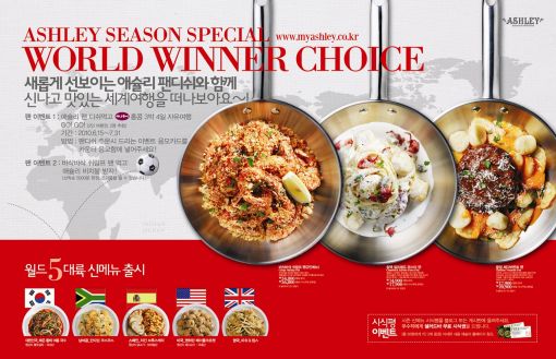박정훈 애슐리 브랜드장은 "월드베스트 신메뉴를 통해 각국 대표 메뉴를 맛보는 즐거움과 함께 풍성한 선물도 받으시고 대한민국 승리도 기원할 수 있는 기쁨의 축제기간이 되길 바란다"고 말했다.