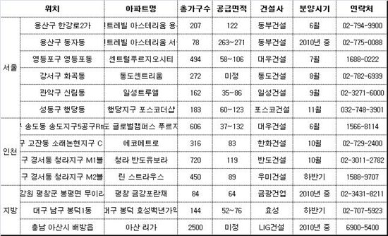 지방에서는 금광건업이 강원도 평창군 봉평면 무이리에 ‘평창 금강포란채’ 84실, 효성은 대구 남구 봉덕1동에 ‘봉덕 효성백년가약’ 144실, LIG건설은 충남 아산시 배방읍에 ‘아산 리가’2500실을 올해 중에 분양할 계획이다.