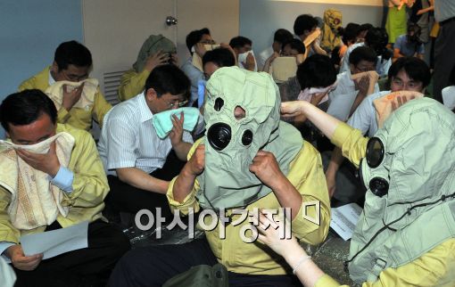 [아시아경제 이재문 기자]민방위 훈련이 21년 만에 전국 단위 화생방 대피 훈련으로 열린 가운데 15일 서울 광화문 정부중앙청사 지하 대피소에서 공무원들이 화생방 경보발령이 내리자 방독면을 착용하고 있다.