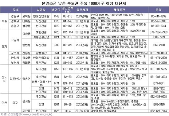 15일 부동산정보업체 스피드뱅크가 소개한 1000가구 이상 대단지 아파트 중 수도권 내 현재 미분양 특별 마케팅을 진행중인 단지는 20여곳에 달했다.