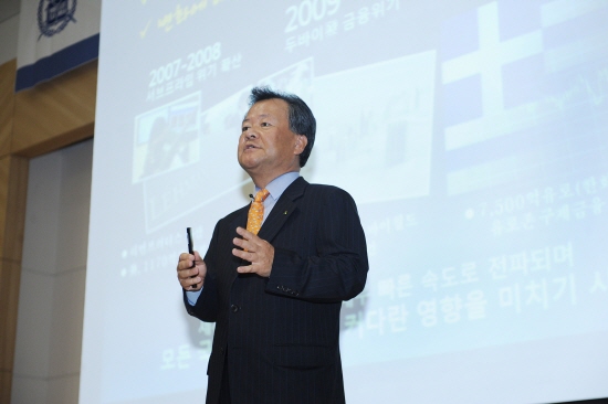 "지난 3월 한국주택협회 회장이 돼서 회의를 하다보니 CEO들 기가 많이 죽어있더라"는 말로 강의를 시작했다. 주택, 토목분야가 침체돼 있고 작년까지 밝다던 해외에서도 유로화가 연초대비 18%나 떨어지며 유럽 업체들 경쟁력이 커졌기 때문이라고 한다.