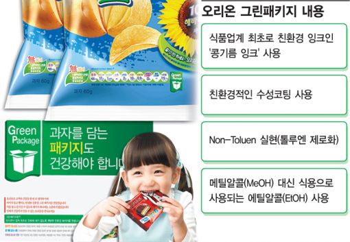 필름 포장의 경우 공업용 화학 첨가제인 톨루엔을 제로화하고 공업용 메틸알코올을 식용 에틸알코올로 대체, 아이들이 과자봉지를 입으로 물고 뜯어도 안전할 수 있도록 했다. 이렇게 그린 패키지를 시행하면서 오리온은 아이들의 건강과 친환경이라는 두마리 토끼를 모두 잡았다.