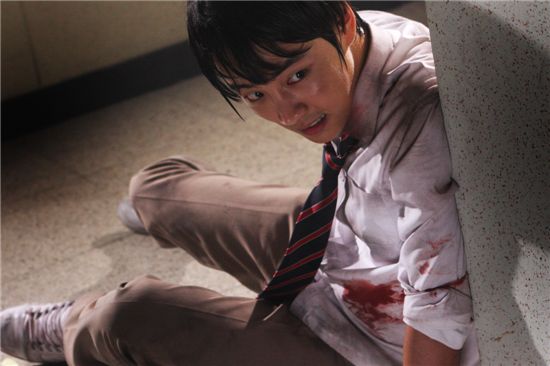 사진 속 윤시윤은 교복을 입고 온몸에 피투성이가 돼 촬영에 임하고 있다.