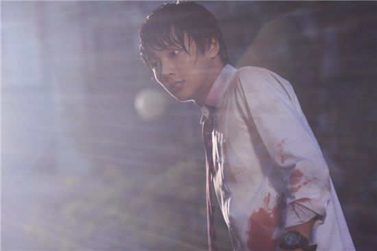 주인공 윤시윤이 피투성이가 된 교복을 입은 채 촬영에 임하고 있다.