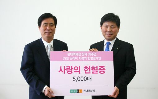 이번에 전달된 헌혈증은 현대백화점이 창사 39주년을 맞아 지난 5월 초부터 6월 중순까지 39일 동안 직원 및 고객들이 참여한 릴레이 헌혈 캠페인을 통해 기증받은 것으로, 혈액 질환을 앓고 있는 환자들을 위해 사용될 예정이다.