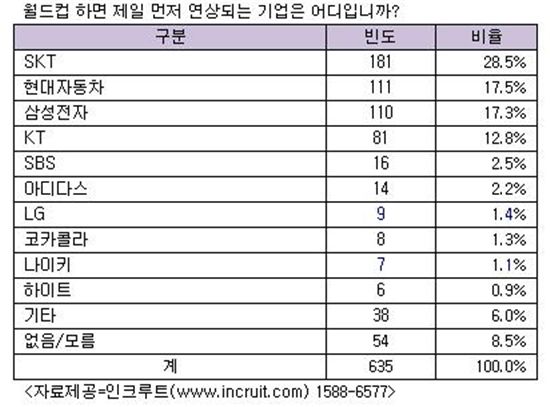 인크루트가 직장인 635명을 대상으로 월드컵하면 떠오르는 기업과 스타를 조사한 결과, 1위로 각각 SK텔레콤(28.5%)과 김흥국(27.9%)이 선정됐다.