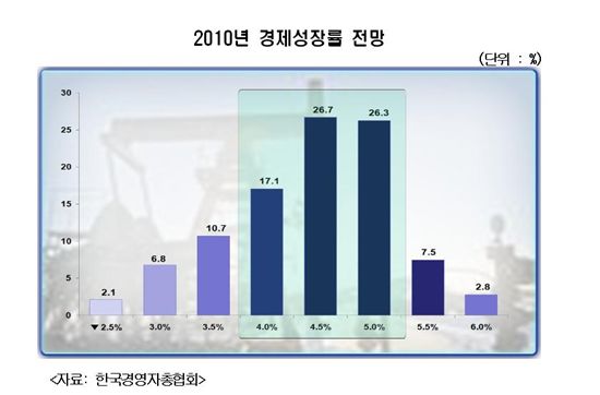 경제성장률 전망치에 대해 4.5%라는 응답이 26.7%로 가장 높았으며, 5.0%가 26.3%로 집계됐다. 기업규모별로 보면 대기업의 경우 5.0% 미만이 될 것이라는 응답이 52.2%, 중소기업은 70.4%에 달하는 것으로 조사됐다.
