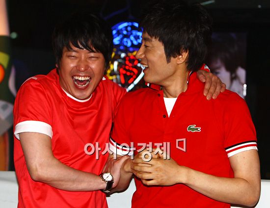 주연배우 김명민과 엄기준이 경기 시작 전 환하게 웃고 있다.