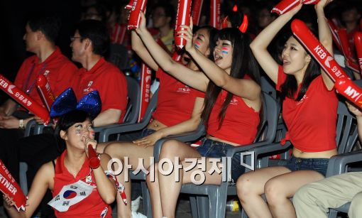 [아시아경제 이재문 기자]한국-아르헨티나 경기가 펼쳐진 17일 서울 외환은행 본점에서 직원들과 고객들이 국가대표팀의 선전을 기원하며 열띤 응원을 하고 있다.