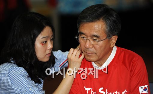[아시아경제 이재문 기자]한국-아르헨티나 경기가 펼쳐진 17일 서울 우리은행 본점에서 이종휘 은행장이 페이스페인팅을 받고 있다.
