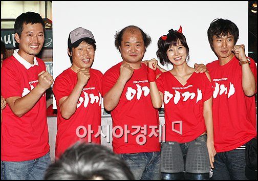 [아시아경제 박소연 기자]2010 남아공월드컵 B조 한국과 아르헨티나의 경기를 앞두고 영화 '이끼'의 주연배우들과 90명의 팬들이 응원에 나섰다.