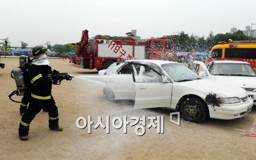 [아시아경제 이재문 기자]18일 오후 서울 한강시민공원 양화지구에서 열린 '2010 소방기술경연대회'에서 소방관들이 교통사고 차량화재 진압시범을 보이고 있다.