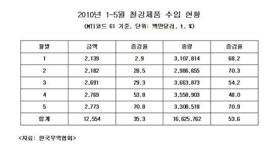 21일 관련 업계에 따르면 올 1~5월 철강제품 수입액은 125억5400만달러로 전년동기(92억8000만달러) 대비 35.3% 증가했다. 중량 기준으로도 같은 기간 1662만5762t으로, 지난해 같은 기간의 838만2721t보다 53.6% 늘었다. 이는 철강수요가 사상 최대였던 지난 2008년 1~5월 159억달러, 1773만0590t에 비해 떨어지지 않는 수준이다.