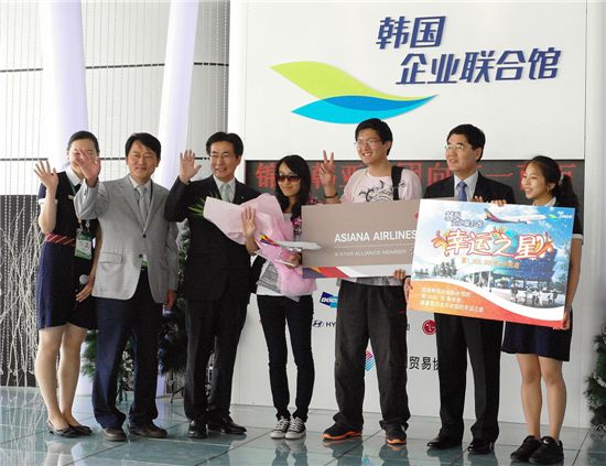 행운의 주인공인 츄 예쳔(22)씨와 치 민원(22)씨는 한국기업연합관 1층에 마련된 행사장에서 박진우 아시아나항공 상하이지점장과 김학서 한국무역협회 한국기업연합관 관장으로부터 축하 꽃다발과 함께 중국노선 왕복항공권을 증정받았다.