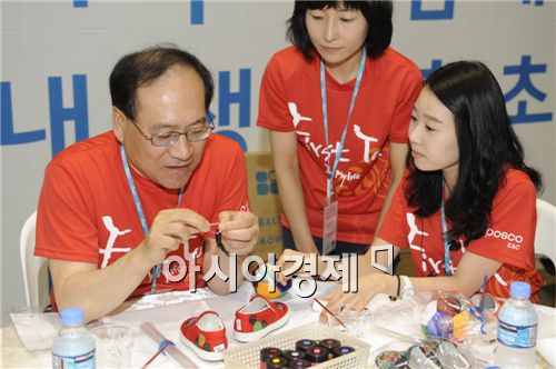 포스코건설 봉사단이 다문화가정 가족들과 함께 연령별 장난감과 월드컵을 기념한 축구화 및 축구공 1000여개를 제작하는 이벤트를 진행했다.