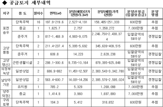 포천송우지구의 경우 단독주택용지 16필지, 종교용지 1필지, 준주거용지 3필지이며 고양풍동지구는 단독주택용지 2필지와 준주거용지 1필지가 공급된다. 고양행신2지구 근린생활시설용지 2필지, 의정부녹양지구 일반상업용지 2필지, 남양주가운지구 일반상업용지 2필지, 유치원용지 1필지, 양주덕정2지구내 종교용지 1필지와 구리토평지구내 단독주택용지 1필지 등이다.