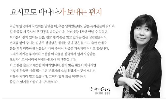 $pos="C";$title="요시모토 바나나가 보낸 편지 ";$txt="요시모토 바나나가 보낸 편지 ";$size="550,332,0";$no="2010062511255612904_1.jpg";@include $libDir . "/image_check.php";?>[아시아경제 서소정 기자]일본 베스트셀러 작가 요시모토 바나나의 신작을 네이버에서 먼저 볼 수 있게 됐다.