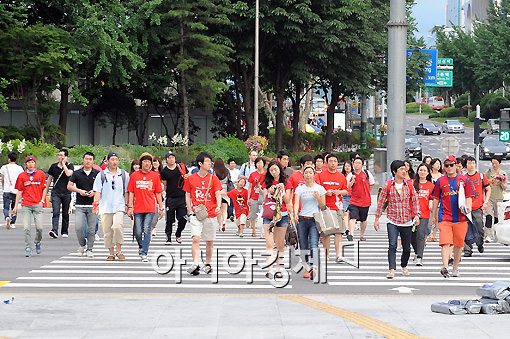 [아시아경제 이기범 기자]2010 남아공 월드컵 한국 대 우루과이 전이 열리는 26일 오후 서울 영동대로에 응원을 나온 시민들이 몰려들고 있다.