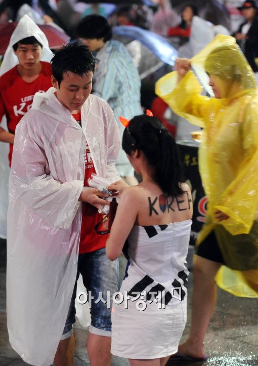 [아시아경제 이재문 기자]한국과 우루과이의 2010 남아공 월드컵 16강 경기를 앞둔 26일 저녁 서울 광화문에 비가 오는 가운데 거리응원 나온 시민들을 상대로 노점 상인들이 우비를 팔고 있다.