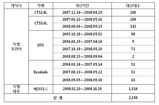 국토해양부는 GM코리아(주)에서 수입판매한 캐딜락 CTS 및 DTS, 럭셔리 SUV 모델인 에스컬레이드(Escalade) 840대와 GM대우오토앤테크놀로지(주)에서 제작 판매한 승용차 베리타스 1314대에서 제작결함이 발견돼 자발적으로 결함을 시정(리콜)한다고 27일 밝혔다.