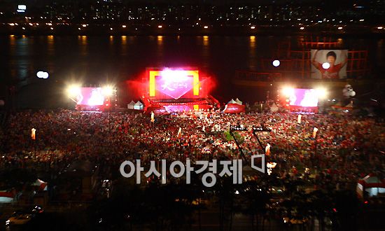 [아시아경제 한윤종 기자]'2010 남아공 월드컵' 16강전 대한민국과 우루과이의 경기를 앞둔 26일 오후 한강시민공원 반포지구에 12만명의 시민들이 모여 응원을 하고 있다.