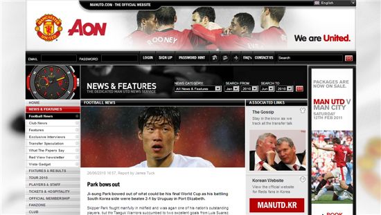 잉글랜드 프리미어리그 맨체스터 유나이티드가 27일(한국시간) 공식 홈페이지에 소속팀 미드필더 박지성의 아쉬운 월드컵 8강 좌절을 톱뉴스로 보도했다.