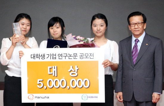 대상에겐 상금 500만원, 최우수상에겐 상금 300만원이 상장과 함께 주어졌다. 시상식엔 한화그룹 최상순 부회장과 한국경영사학회 김신 회장, 충청지역 경영학과 교수들이 수상자들을 격려했다.