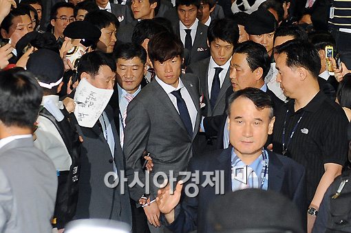 [인천공항=아시아경제 이기범 기자]'2010 남아공 월드컵' 한국 국가대표 팀이 사상 첫 원정 16강 진출의 위업을 이뤄낸 가운데 29일 오후 인천국제공항을 통해 귀국한 박지성 선수가 입국장을 빠져 나가고 있다.