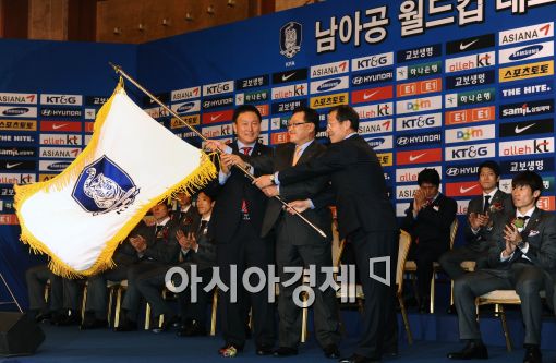 [아시아경제 이재문 기자]남아공 월드컵에서 원정 첫 16강을 달성한 축구국가대표팀이 29일 오후 서울 소공동 롯데호텔에서 해단식 및 기자회견을 갖고 있다. 이날 허정무 감독,노홍섭 단장, 조중연 회장이 단기를 흔들고 있다.