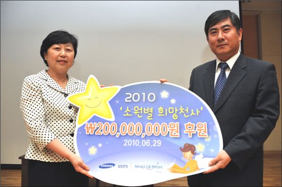 삼성전자는 2007년부터 매년 2억원씩 총 6억원의 성금을 모금해 메이크어위시재단에 전달했고, 이를 통해 지금까지 모두 230명의 난치병어린이들이 소원을 이뤘다고 전했다. 삼성전자 관계자는 “올해도 300여명의 삼성전자 임직원들과 180명의 대학생 자원봉사팀으로 구성된 ‘위시엔젤’들이 80여명의 난치병 아동들과 결연을 맺고 아이들의 소원을 이뤄 주는 ‘희망천사’가 될 예정”이라고 설명했다.