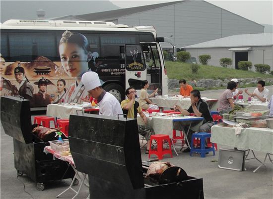 지진희는 지난 1일 '동이' 촬영이 한창인 용인 오픈세트장에 200인분의 출장 바비큐를 불러 스태프와 배우들에게 특별한 저녁 식사 자리를 마련했다.