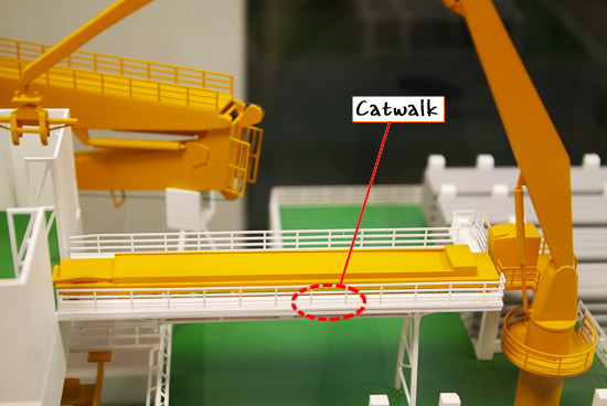 그런데, 다리의 운반장치 옆으로 사람이 다닐 수 있는 통로가 있다.(사진) 이 통로는 오래된 굴착장치에서는 그 폭이 좁기도 했지만 위험한 장비들을 운반하는 곳이라 사람들이 통행할 때 아주 조심스럽게 머리를 숙이고 통행해야 했다고 한다. 그 모습이 마치 고양이가 사뿐사뿐 걷는 것처럼 보인다고 해 통로 이름을 ‘캣워크(Catwalk)’라고 부르게 됐고, 이 명칭은 지금도 사용되고 있다.